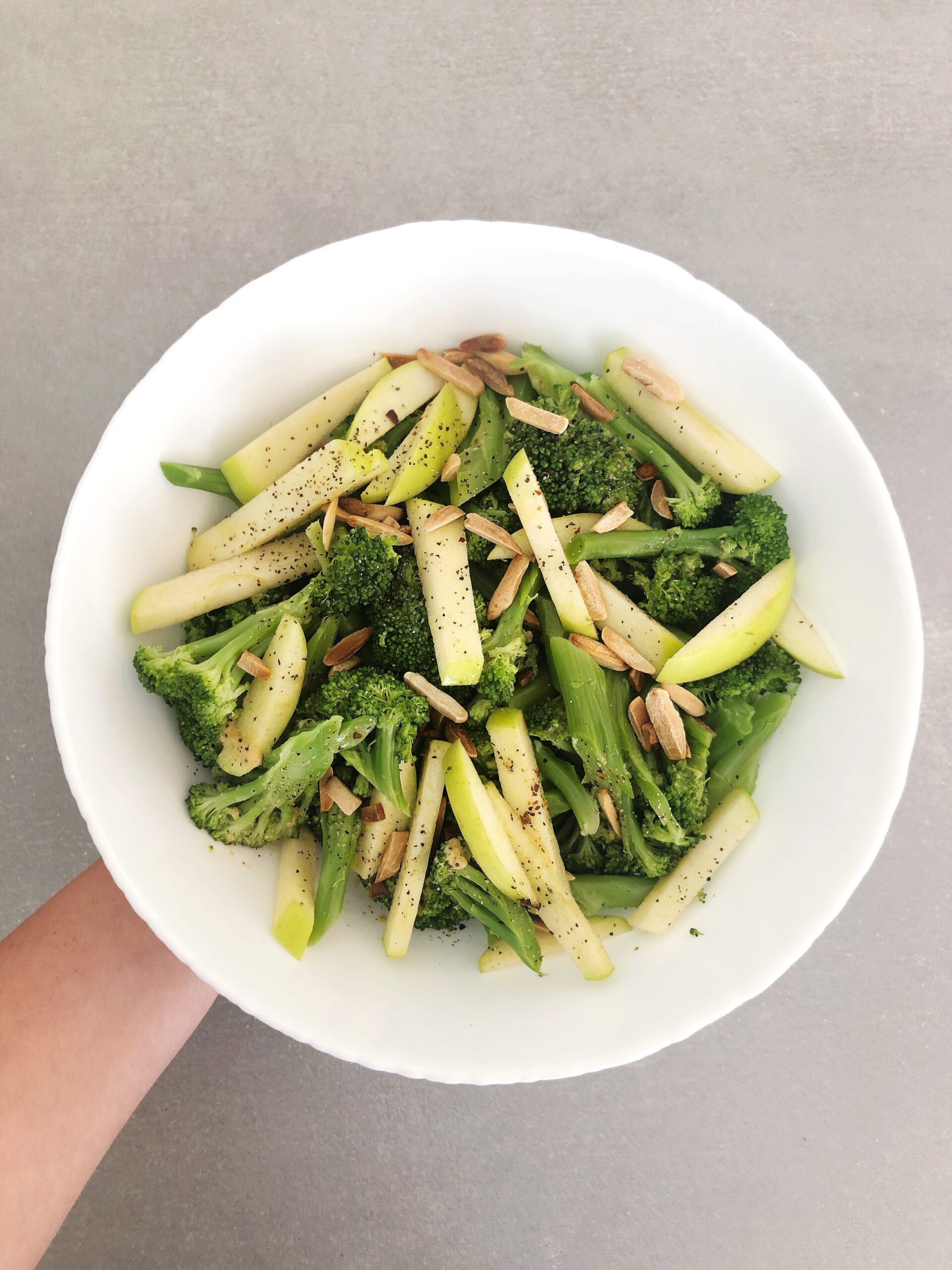 Blanch broccoli florets and allow to cool. Use a paper towel to remove any excess water from the broccoli florets. In a large bowl, combine broccoli and apples (cut julienne keeping the skin). Meanwhile, toast the almonds over medium heat, tossing them occasionally so they don’t burn. To prepare the dressing, mix together lemon juice, olive oil, maple syrup, Dijon mustard, black pepper and salt to taste. Drizzle the dressing just a little at a time over the salad and toss to combine. Sprinkle on top the roasted almonds (can use around 1/3 cup). Chill for an hour before serving. It tastes better chilled and when the flavors have had time to blend together. Enjoy and Bon Appétit!