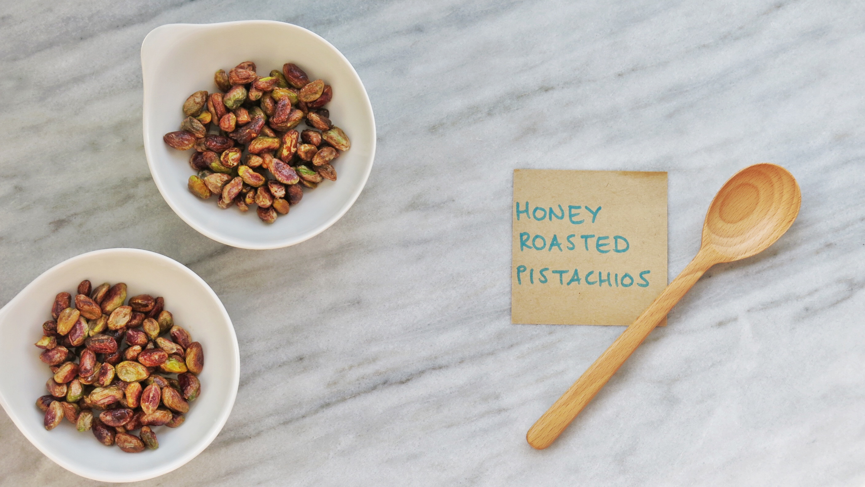 Mix the honey and the pistachios well. Bake for 7 minutes at 250°C (do not preheat oven). It’s that simple! Enjoy and Bon Appétit!