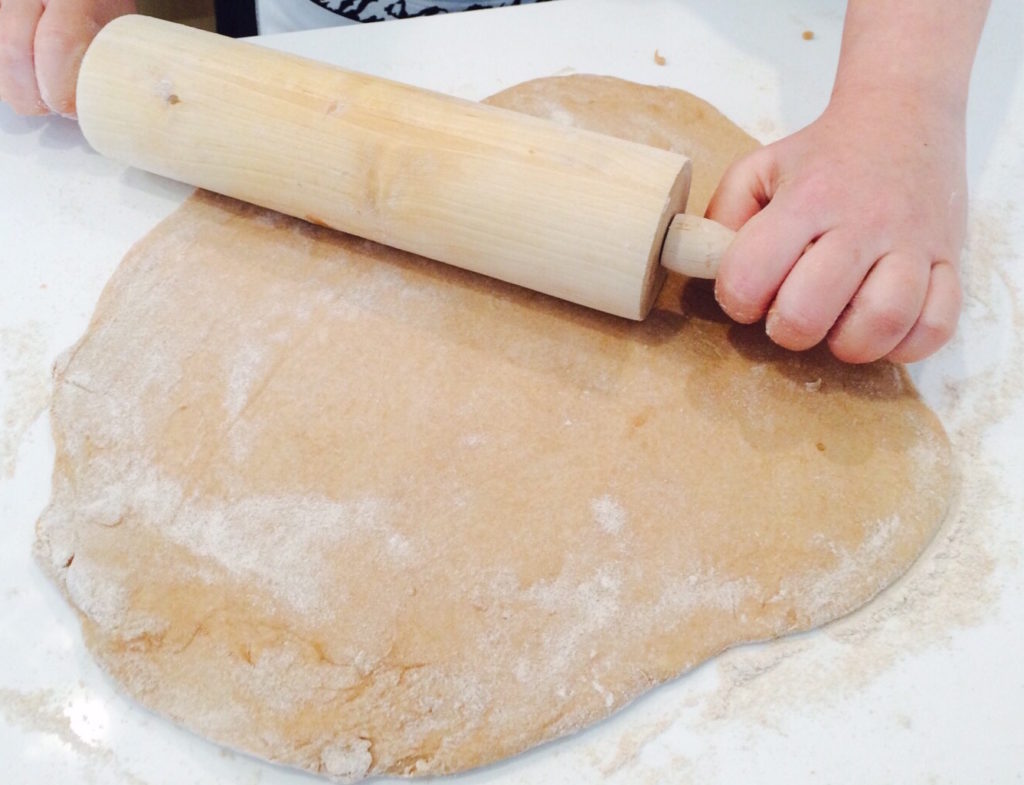 Prepare the dough by mixing all the ingredients together except the water (I usually don’t add the sugar). Mix the ingredients well using your clean, flour-dusted hands and then slowly start adding water; start with 1 cup and mix then keep adding until the desired texture is achieved (you don’t want the dough sticking to your hands). Once done, place the ball of dough in a large flour-dusted bowl and flour the top of it. Cover the bowl with a damp cloth and let the dough rest for at least an hour in a warm place until the dough has doubled in size. Meanwhile, place on a clean surface and on your rolling pin some flour. When the dough is ready, knead it around a bit to push the air out with your hands. Note that you can either use the dough immediately, or keep it, wrapped in clingfilm, in the fridge or freezer until required. If using straight away, divide the dough into as many small balls. Roll the ball on the floured surface. Use your hand to press it down to a flatter circle. Take the rolling pin and start rolling, turning the dough occasionally.